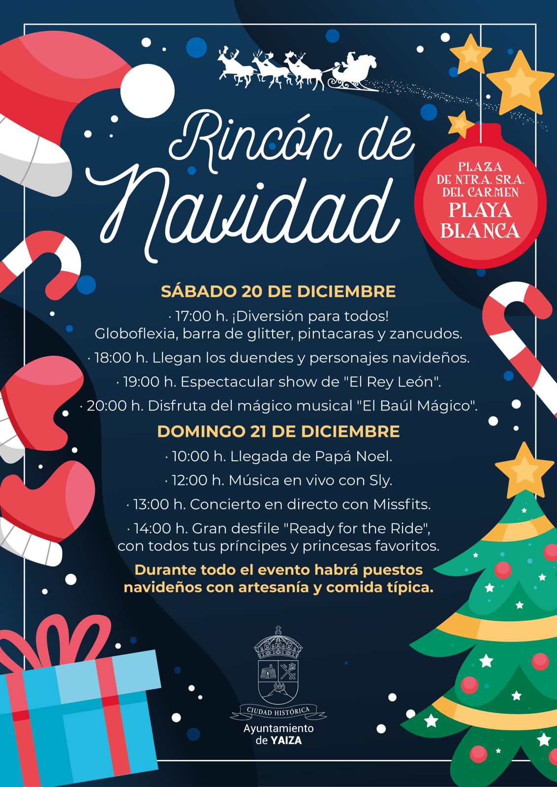 El Ayuntamiento de Yaiza publica el Anuncio por el que se convoca a las personas o entidades interesadas en instalar y regentar puestos durante el evento Rincón de Navidad previsto para los días sábado 20 y domingo 21 en la Plaza del Carmen de Playa Blanca. El tiempo de ocupación será el 20 de diciembre de 2025, 17:00h a 22:00h, y el 21 de diciembre de 2025, 10:00h a 15:00h. El plazo de presentación de las solicitudes será de QUINCE (15) DÍAS NATURALES, desde 19 de noviembre de 2025 al 3 de diciembre de 2025 (ambos inclusive). La Administración sugiere leer íntegramente el Anuncio: Anuncio Puestos de Navidad Evento Plaza del Carmen