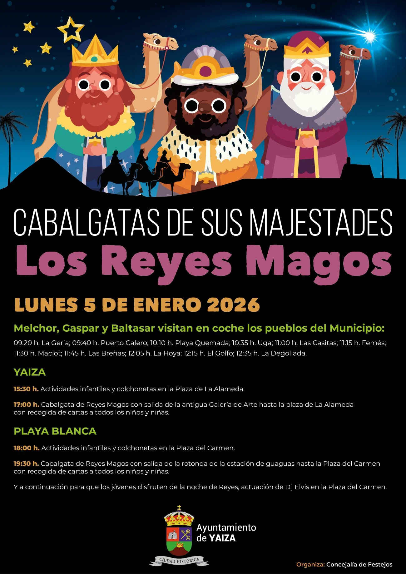 Las cabalgatas serán el lunes 5 de enero a las 17:00 h en Yaiza y a las 19:30 h en Playa Blanca. Durante la mañana del mismo 5 está previsto un recorrido por los pueblos del municipio. El municipio de Yaiza tiene cerrada su agenda de la ilusión para el próximo 5 de enero: las cabalgatas de Reyes Magos con camellos serán el lunes a las 17:00 horas en Yaiza y a las 19:30 horas en Playa Blanca, aunque este mismo día Melchor, Gaspar y Baltasar empiezan su jornada a primera hora de la mañana para recorrer en coche los distintos pueblos del sur de Lanzarote. […]