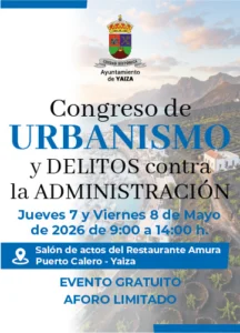 El Ayuntamiento de Yaiza abre este nuevo espacio de conocimiento y debate, invitado a Lanzarote a prestantes profesionales del Poder Judicial y técnicos especialistas en materia urbanística y planeamiento del territorio, que tratarán en dos días de jornadas temáticas de interés relativas al urbanismo y delitos contra la Administración. El encuentro será los días jueves 7 viernes 8 de mayo de 2026, en horario de 9:00 a 14:00 horas, en el salón de actos del Restaurante Amura de Puerto Calero. El evento es gratuito con inscripción previa.