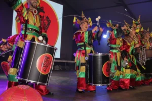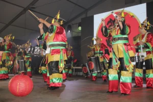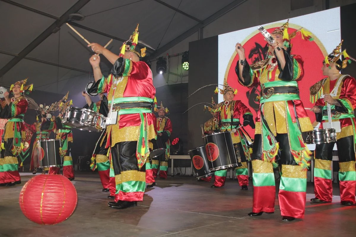 La milenaria cultura japonesa también llamó a la puerta del Carnaval sureño. Desembarcaron en Uga Los Guerreros del Sol Naciente, nada menos que 22 guerreros y guerreras de la batucada Los Yaiseros, dirigidos musicalmente por Willy Morales.