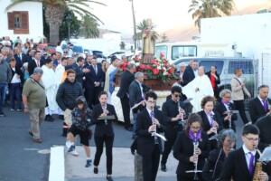 Fieles y acompañantes participaron a las siete de la tarde de la función religiosa presidida en la plaza por Juan Carlos Medina, vicario de Fuerteventura, Lanzarote y La Graciosa y párroco de San Ginés en Arrecife, para luego emprender desde la ermita la procesión por las calles de Femés en compañía de la Banda Municipal de Yaiza.