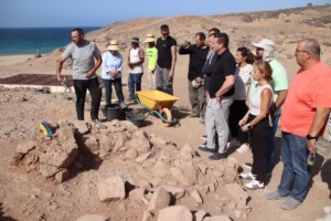 El director general de Cultura y Patrimonio Cultural, Miguel Ángel Clavijo; el alcalde de Yaiza, Óscar Noda, la concejala de Patrimonio, Silvia Santana, y ediles sureños visitaron el yacimiento junto a las investigadoras y coordinadoras del convenio de colaboración, Esther Chávez y María del Cristo González, para conocer los avances del proyecto en la primera ciudad europea del Atlántico.