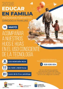 El Ayuntamiento de Yaiza valora especialmente el provecho que puedan conseguir madres, padres y tutores, e incluso, los mismos colegios públicos del municipio, del programa Educar en Familia en el desarrollo educativo de niños y niñas. La Administración subraya el “interés ciudadano” en la presente edición del ciclo de cuatro talleres que finalizará el lunes 18 de mayo con la charla ‘Acompañar a nuestros hijos e hijas en el uso consciente de la tecnología’, que impartirá la psicóloga Laura de la Cruz en el CEO Montaña Roja de Playa Blanca, en horario de 16:00 a 18:00 horas, con entrada libre e inscripción previa llamando al Área de Servicios Sociales 928 83 68 34.